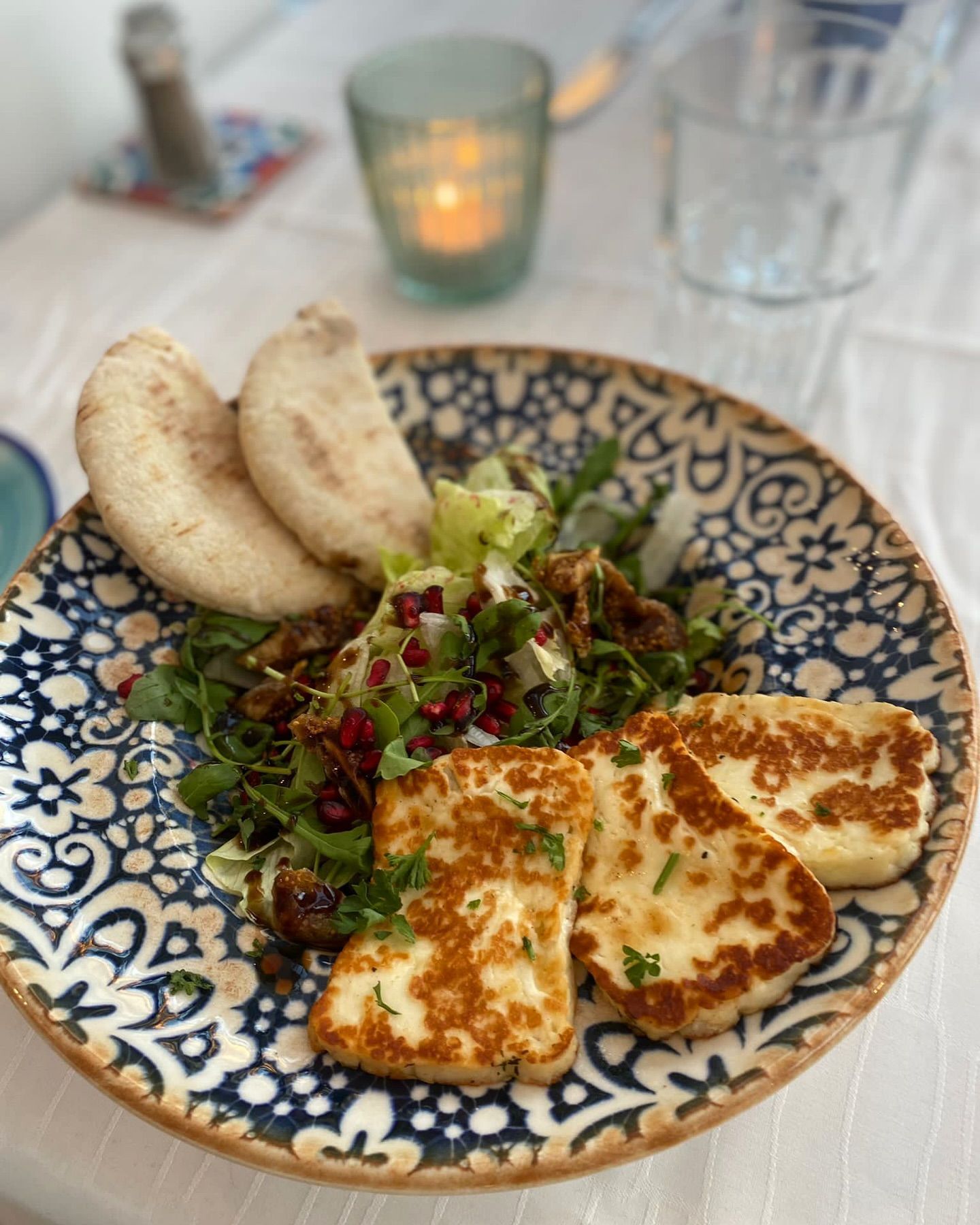 • Aitoa kyproslaista halloumijuustoa vihersalaatti-ruccola pedillä, kuivatun viikunan, makean granaattiomenan ja tumman balsamicokastikkeen ja pitaleivän kera.