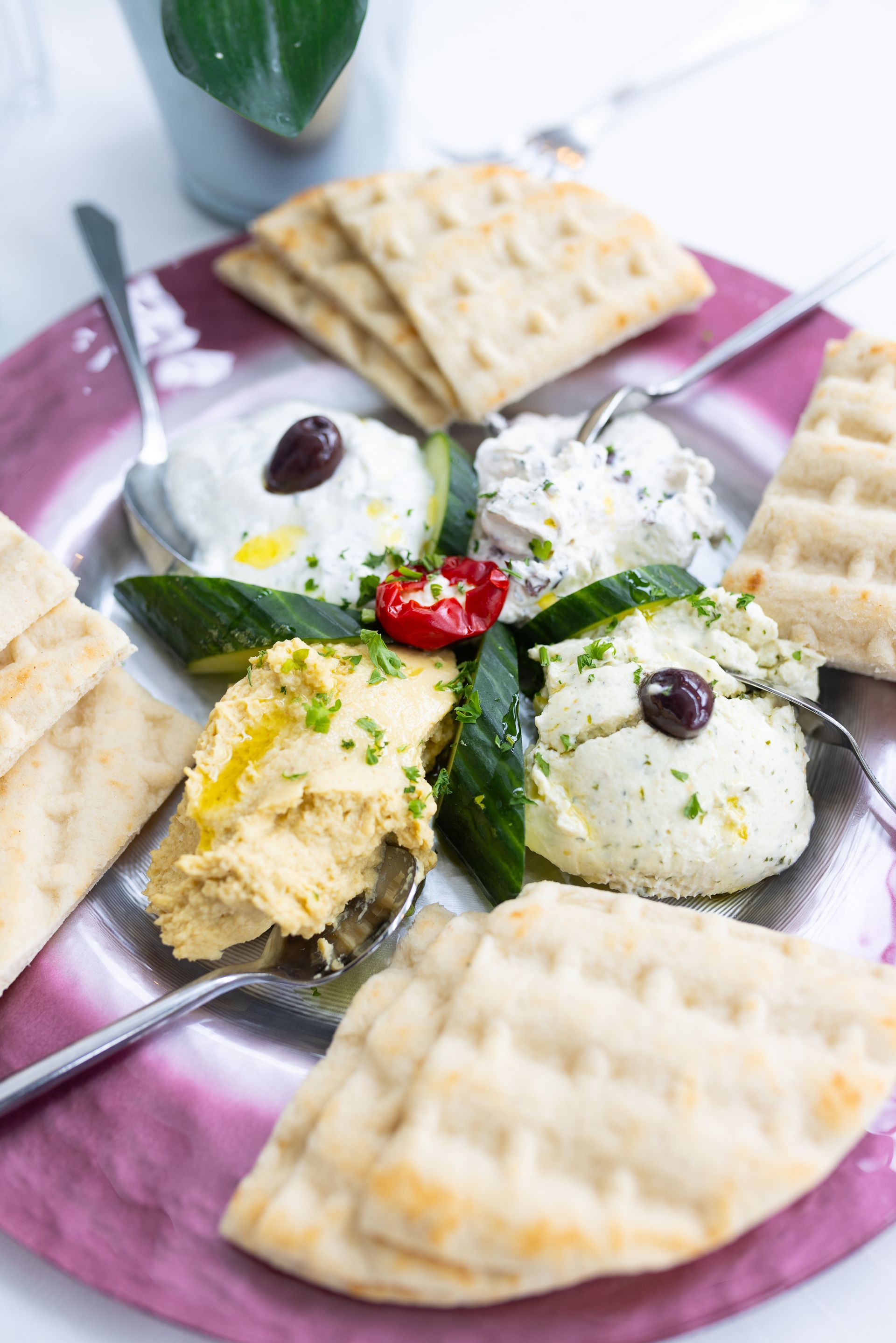 • Perinteinen kreikkalaisesta jogurtista, tuoreesta kurkusta, valkosipulista ja mintusta valmistettu dippi ja pitaleipää