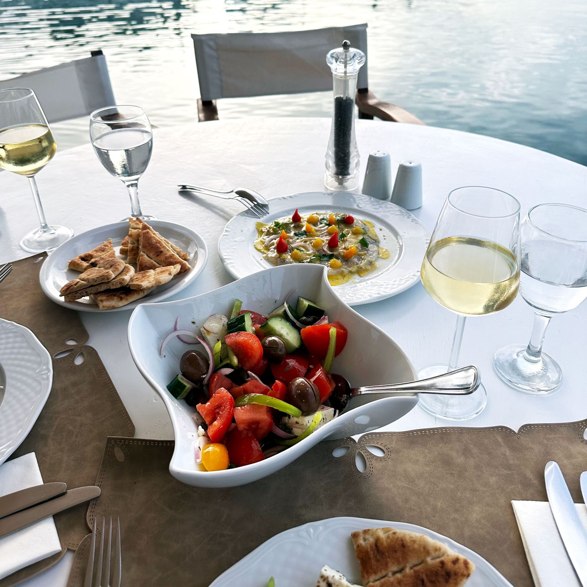 • Kreikkalainen salaatti, tomaattia, kurkkua, punasipulia, paprikaa, oliiveja ja aitoa fetajuustoa pitaleivän kera.