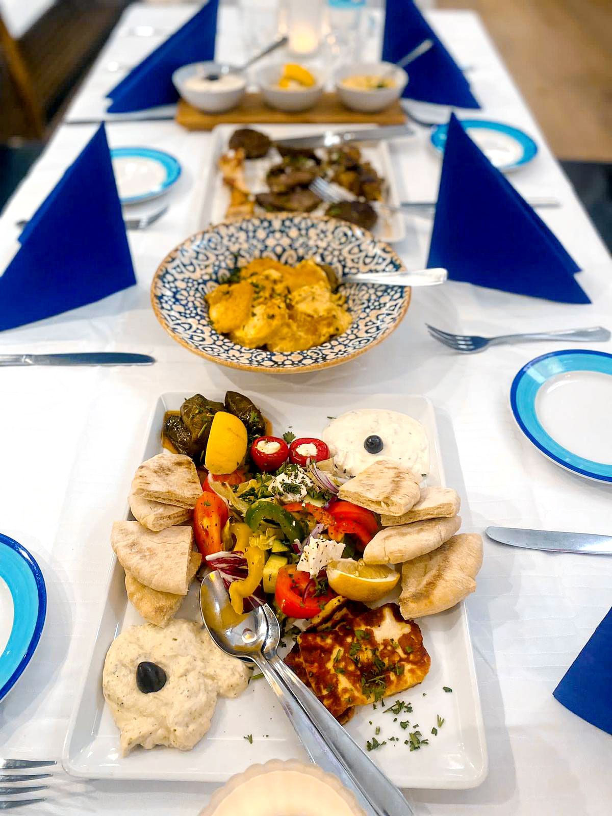 tzatzikia ja pitaleipää. Pääruoaksi kanagyrosta- ja porsaanfilevarras,